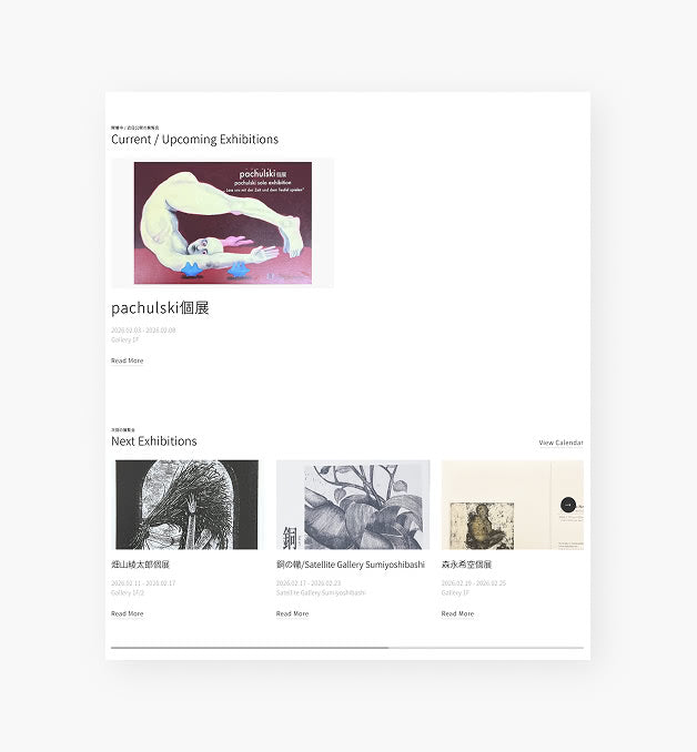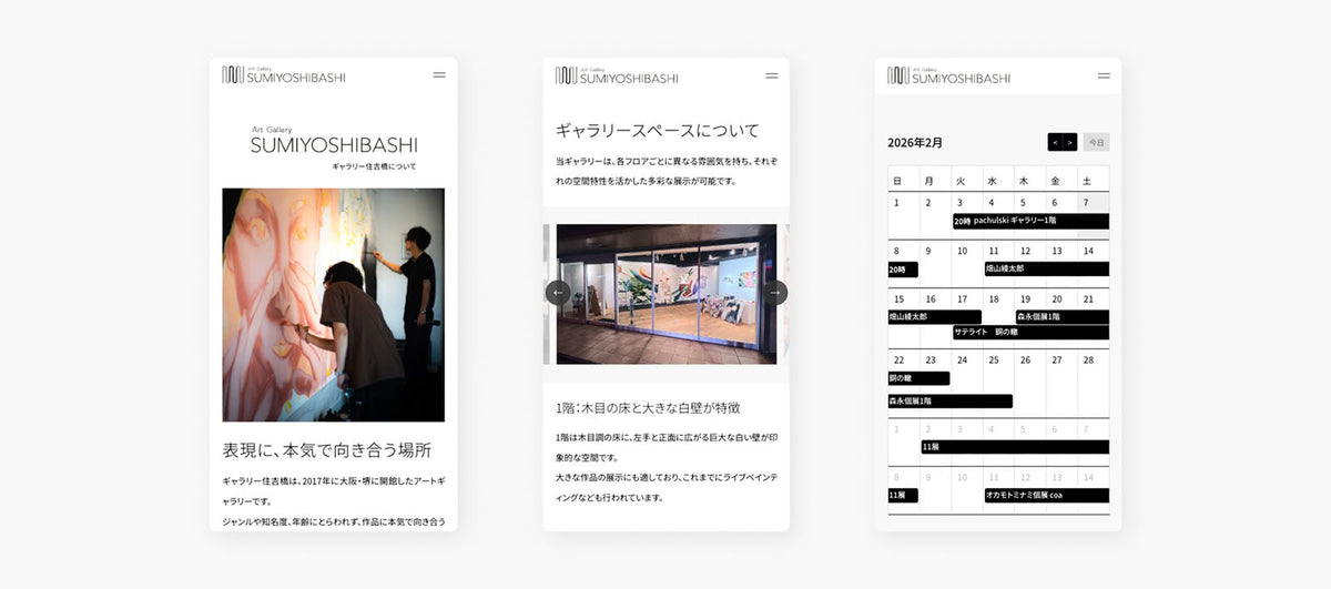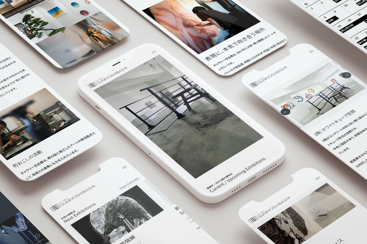 ギャラリー住吉橋様のブランディングを担当させていただきました。貸し画廊から若手作家の発掘・支援への事業転換に伴い、「作家の熱意を橋渡しする」理念を軸に、専門家の鑑賞に堪えうる洗練されたデザインへ刷新しました。一方、機能面では過去の展示情報を体系化しSEOを強化。さらにシステム連携により、Webサイトの更新工数を従来の半分以下に圧縮する業務改善も実現しています。