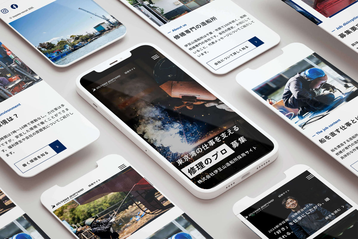 コーポレートサイトに引き続き、株式会社伊豆山造船所様の採用サイトを担当させていただきました。当初は1つのサイトに採用ページを設けたいとのご相談を受けましたが、ターゲットも目的もに二重になっては効果が薄れてしまうため、サイトを分けて作ることをご提案。造船所の全景や溶接のシーンなどお客様のご協力あって、リアルなシーンを映すことができました。3ヶ月の間何度も伺い、造船所の仕事や社員の皆様のことをよく知った上でインタビューや原稿作りを行うことができました。写真も原稿も、盛らずありのままを表現することを意識しました。